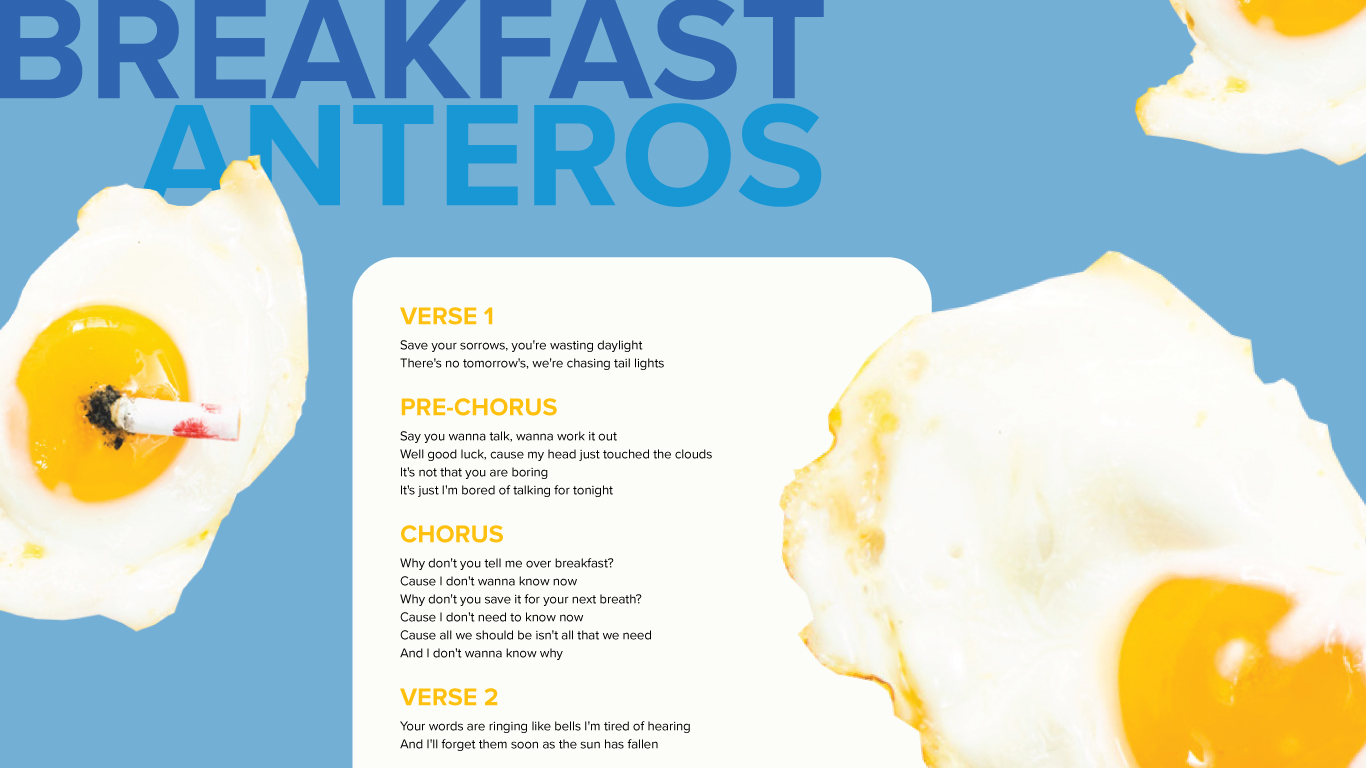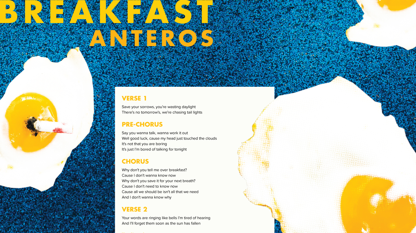 Because my design is based on the album art for the band's EP, I was told to push this further by making the background glittery and using a closer typeface to the album. I nixed the rounded edges of the box and masked the compression on the eggs by adding a halftone filter to them in Photoshop. I was told to make the artist's name smaller so it didn't read as on the same tier of the visual hierarchy as the song title (the artist name seemed like it was part of the song title in the first pass). Finally, I made the section titles slightly smaller because they were overwhelming the lyrics.